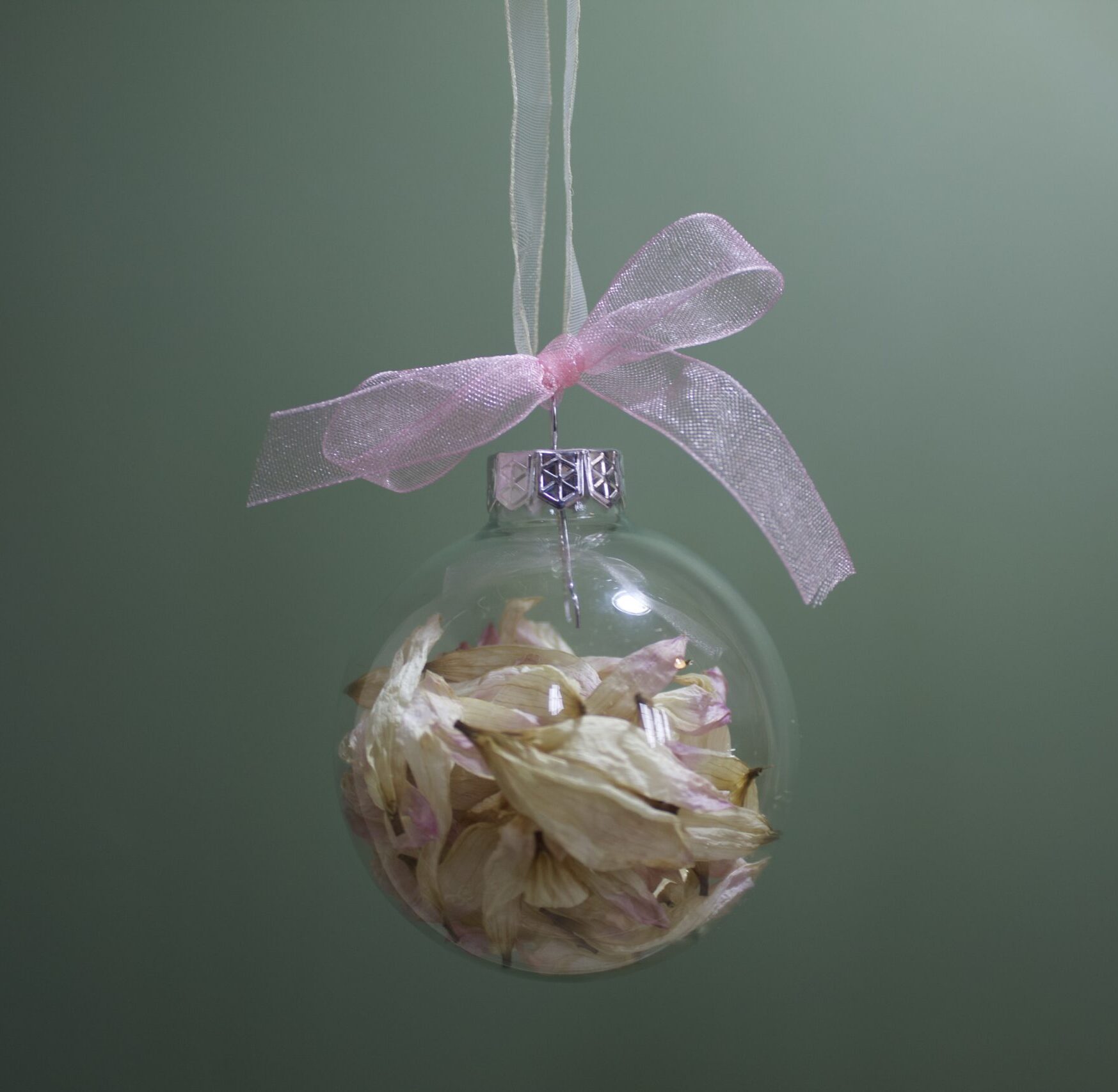 Medium glass bauble filled with pink and white dahlia petals on a white ribbon with a pink bow.